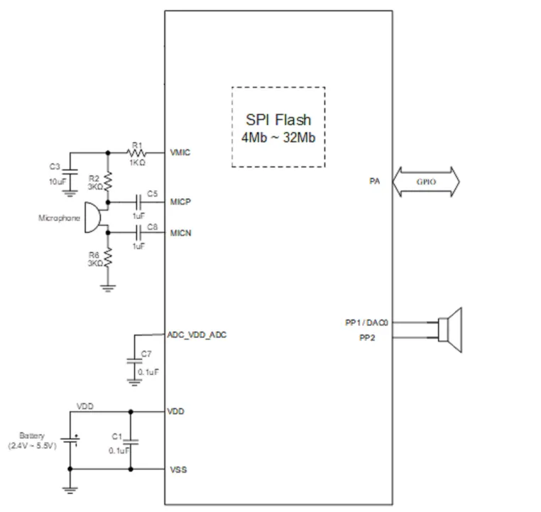 There are various useful features inside the VLN3M series: Three sets of 16-bit Timers; 8-ch H/W PWM-IO pins, which provide complimentary outputs (with dead zone generator) and capture feature; 8-channel, 12-bit SAR ADC with MIC pre-amplifier & AGC / PGA that supports differential MIC input; 14-bit DAC + 1.3-watt Push-Pull power amplifier to drive speaker directly; independently configurable GPIO per pin with alternate functions; IR TX that supports 38KHz / 57KHz / 125KHz / 500KHz carrier for Infrared or QFID applications; SPI0 for SPI flash control, powered by embedded optional 3.3V / 1.8V LDO, which supports single/dual/quad I/O mode with XIP (eXecute In Place) capability; SPI1 for 2.4GHz RF module or other SPI devices; SDHC 2.0-compliant memory card; I2C H/W interface and UART TX / RX for serial communication.