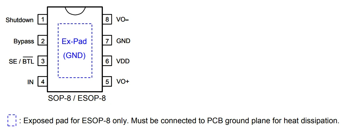 (3). High output power: POUT is 2.5W for VDD = 5V, Load =4Ξ©, f = 1kHz and THD+N = 10%.